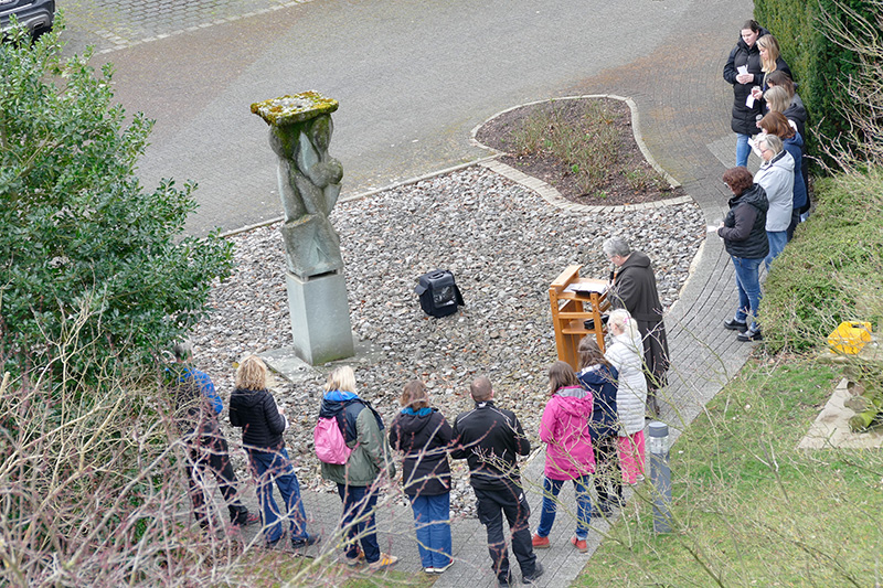Vier Jahre nach dem Beginn des russischen Angriffskriegs auf die Ukraine stehen immer noch Mitarbeitende der Evangelischen Frauenhilfe in Westfalen da und halten vor dem Mahnmal gegen Gewalt ...