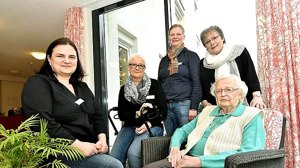 Was Betreuungskräfte für die Rund-um-Versorgung alter Menschen leisten, darüber berichten Stefanie Topka, Christiane Herold, Ulrike Ollinger, Edna Künne, die das Lina-Oberbäumer-Haus und das Hanse-Zentrum leitet sowie Bewohnerin Käthe Leismann. © Dahm