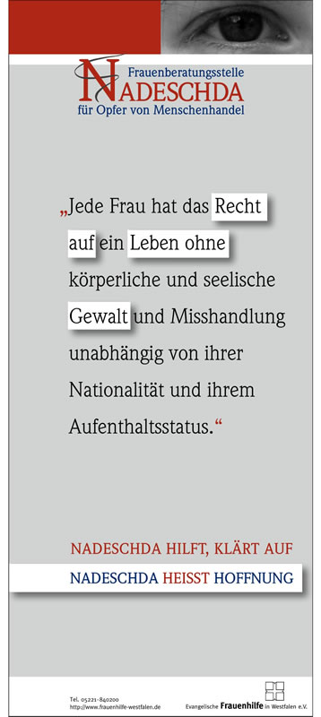 Die spezialisierte Frauenberatungsstelle für Opfer von Menschenhandel, Nadeschda in Herford, ist die einzige Beratungsstelle im ländlichen Raum und für den gesamten Regierungsbezirk Detmold zuständig. Sie besteht in diesem Jahr 20 Jahre und hat in dieser Zeit deutlich gemacht, dass ein spezialisiertes Hilfeangebot auch im ländlichen Raum von NRW dringend erforderlich ist, da es Menschenhandel entgegen landläufiger Wahrnehmungen nicht nur in den Großstädten gibt. Näheres unter www.nadeschda-owl.de