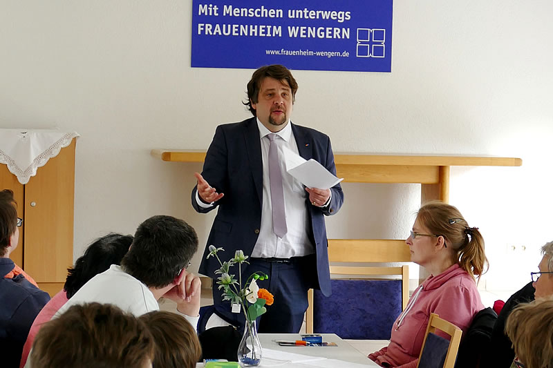 So stellte sich der Vater einer knapp 20-monatigen Tochter den Fragen der Mitarbeiter*innen, Beschäftigten, Bewohner*innen und Klient*innen der Behinderteneinrichtungen. Dabei ging es um die Umsetzung der UN-Behindertenrechtskonvention auf europäischer Ebene, um behindertengerechten Wohnraum, geschützte Arbeit und Verdienstmöglichkeiten für Menschen mit Behinderungen in Europa sowie die verbindliche Anwendung leichter Sprache.
