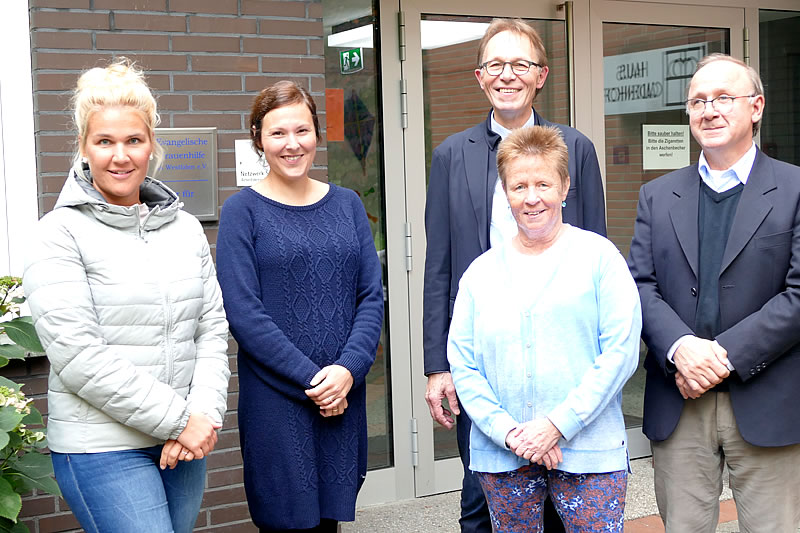 Ein Teil des Fachteams der beiden Fachseminare für Altenpflege – Jennifer Monser, Andrea Wiemann, Luise Finken, Paul Linnemann und Bogdan Labanski (v.l.) - stellten sich den Fragen der anwesenden Kooperationspartner.