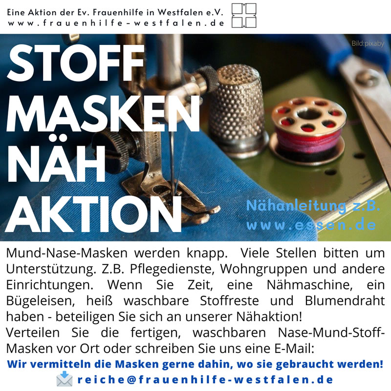 Wenn Sie Zeit, eine Nähmaschine, ein Bügeleisen, heiß waschbare Stoffreste und Blumendraht haben, kann es losgehen: Beteiligen Sie sich an unserer Nähaktion für Mund-Nasen-Masken. Verteilen Sie die Masken bei sich vor Ort, wo sie gebraucht werden. Oder melden Sie sich bei uns, wir vermitteln Ihre Masken auch weiter. reiche@frauenhilfe-westfalen.de