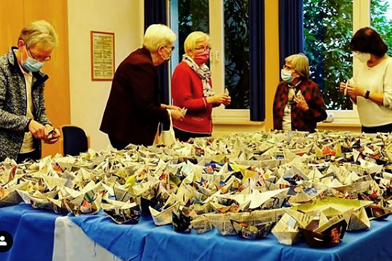 Mit der Aktion „Tausend Boote falten - in Gedenken an die Toten im Mittelmeer“ rief der westfälische Frauenverband auf, aus Zeitungspapier Schiffe zu falten. 1.319 Papierboote sollten es mindestens sein, denn so viele Menschen fanden nach Angaben der UNO-Flüchtlingshilfe 2019 den Tod. Damit soll an unterschiedlichen öffentlichen Orten in Westfalen der Forderung nach einem Ende der Kriminalisierung der zivilen Seenotrettung Ausdruck gegeben werden.