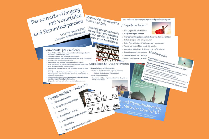 In einem anschließenden Rollenspiel „Am Stammtisch“ nahmen je zwei Frauen aus dem Frauenkreis Bad Lippspringe es mit je zwei „Parolenschwingerinnen“ auf. Sie testeten verschiedene Strategien und Argumente, die später mithilfe der übrigen Beobachterinnen ausgewertet wurden. Am Ende gab es noch 7 sogenannte „Kontra-Antworten“ zum souveränen Ausstieg, die einfach zu merken sind und ein deutliches Statement darstellen, ohne eskalierend zu wirken.