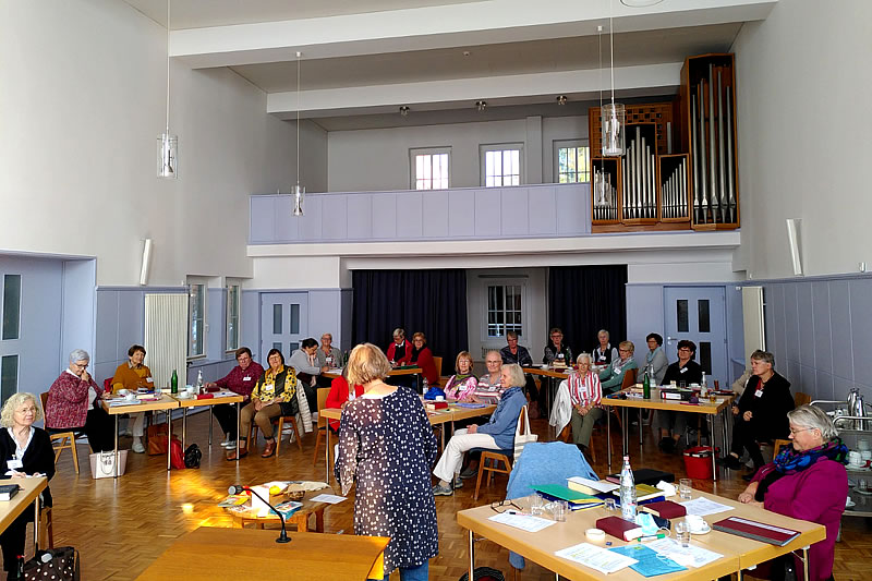 Die anschließende Arbeit mit dem „Handbuch für Gruppenleiterinnen“, in dem es von Satzung über Andachten, Finanzen, gesetzliche Regelungen in der Gruppenarbeit, Tipps zur Öffentlichkeitsarbeit und Ehrenamt nahezu alles zu finden gibt, wurde interaktiv gestaltet. Die Frauen hatten Gelegenheit zu fragen, brachten sich selbstbewusst in die Impulsvorträge ein. Nach einem Rückblick auf die platzierten bunten Fußabdrücke waren sich alle einig: „Wir kommen gerne im Mai wieder!“