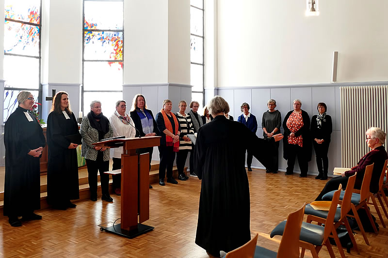 Alle sieben Frauen waren in der diesjährigen Mitgliederversammlung Anfang Oktober in den Vorstand gewählt bzw. berufen worden. Im Festgottesdienst wurde ihnen Unterstützung zugesagt, „sich für Gerechtigkeit, Frieden, gelingende Gemeinschaft und – gemäß dem Ziel aller Frauenhilfearbeit – für ein Leben in Fülle für alle Menschen einzusetzen.“ Die Predigt hielt die Leitende Pfarrerin Birgit Reiche zum Wochenspruch „Lasst uns aufeinander achthaben und einander anspornen zur Liebe und zu guten Werken (Hebräer 10,24)“. Liturginnen waren Verbandspfarrerin Lindtraut Belthle-Drury und Pfarrerin Anne Heckel, Frauenbeauftragte der Evangelischen Kirche von Westfalen.