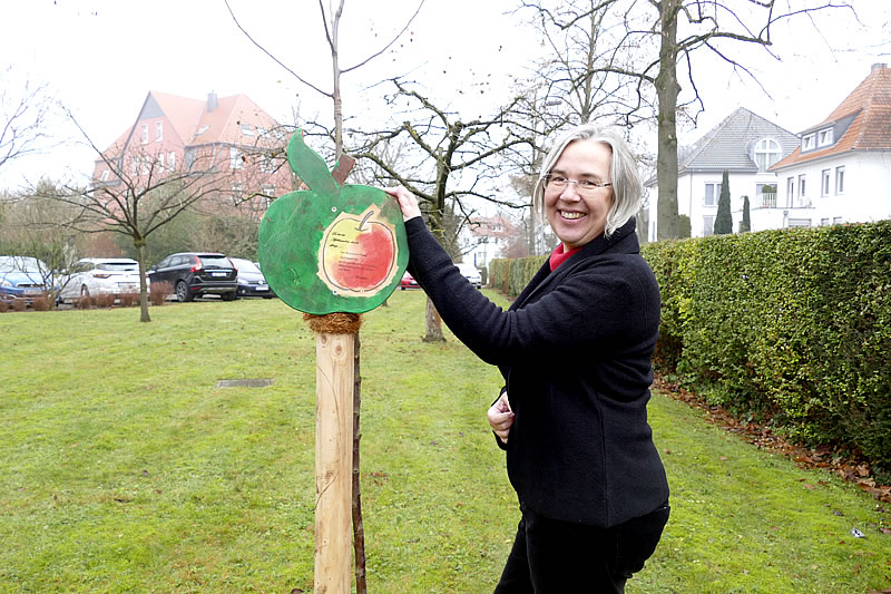 Kinder des Evangelischen Familienzentrums Wichern Kindergarten in Lippstadt hatten den Holzapfel bunt bemalt und mit der Botschaft versehen: „Du bist das Apfelbäumchen, das ich pflanze… Den Mitarbeiter*innen der Frauenhilfe – Danke!“ Nun war endlich die Möglichkeit zu dem Holzapfel den Apfelbaum der Sorte „Nathusius Taubenapfel“ zu gesellen.