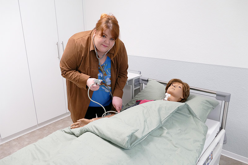 „Das theoretisch Gelernte kann direkt in praktische Übungen umgesetzt werden“, erklärt die 34-jährige. Die Wundversorgung mit speziellen Wundauflagen, die Stomaversorgung, das Legen eines Blasen-Dauerverweil-Katheters oder auch die pflegerische Grundversorgung im Bett und am Waschbecken können die Lernenden einüben und vertiefen. „Die Auszubildenden betonen besonders die verschiedenen Altersklassen der Puppen und die Ordnung der Materialien in verschiedene Pflegesettings als großen Vorteil“, stellt die Standortleiterin fest. Fünf Puppen, davon ein Kind und zwei Babys, und die jeweils passenden Betten stehen im Demo-Raum zur Verfügung. Die Lernenden können jederzeit selbstständig nach Absprache mit einer Lehrkraft im Demo-Raum praktische Tätigkeiten einüben. Im Stundenplan sind zudem feste Stunden im Demo-Raum eingeplant, teils intensivere Tage mit jeweils kleinen Gruppen, teils kreativ in Projekten.